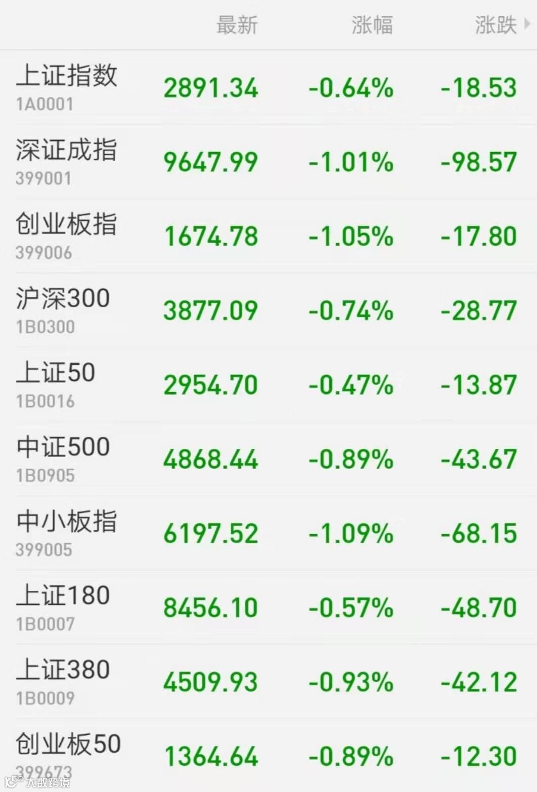 1、A股:上证指数收跌0.64%报2891.34点,深证成指跌1.01%报9647.99点,创业板指跌1.05%报1674.78点,万得全A跌0.89%。两市成交4011亿元。上周,三大指数均跌超2%。