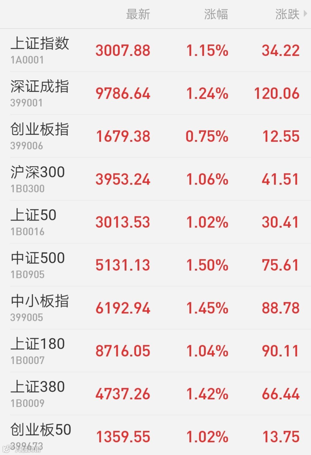 1、A股:上证指数收报3007.88点,涨1.15%;深成指报9786.64点,涨1.24%;创指报1679.38点,涨0.75%。万得全A涨1.29%,两市成交额5351亿元,较上一交易日放大近800亿,北向资金全天单边净流入27.01亿元。