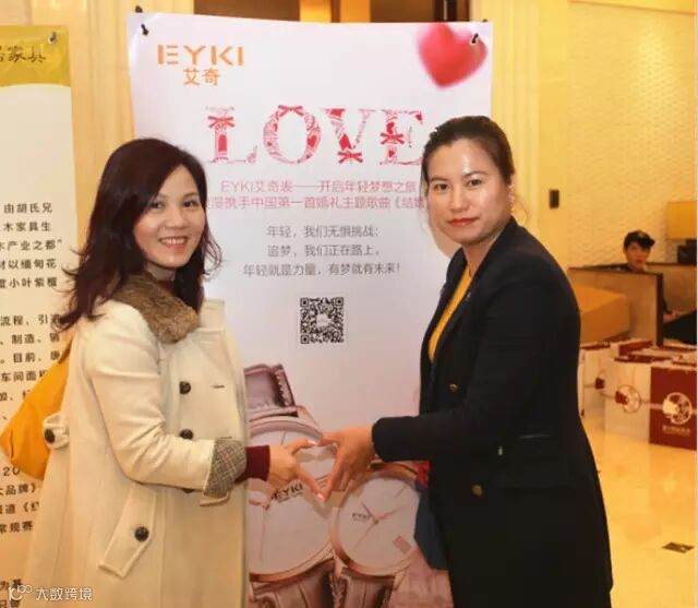 林董事长和汪总监在EYKI艾奇手表宣传画前表达对天下有情人的祝福。