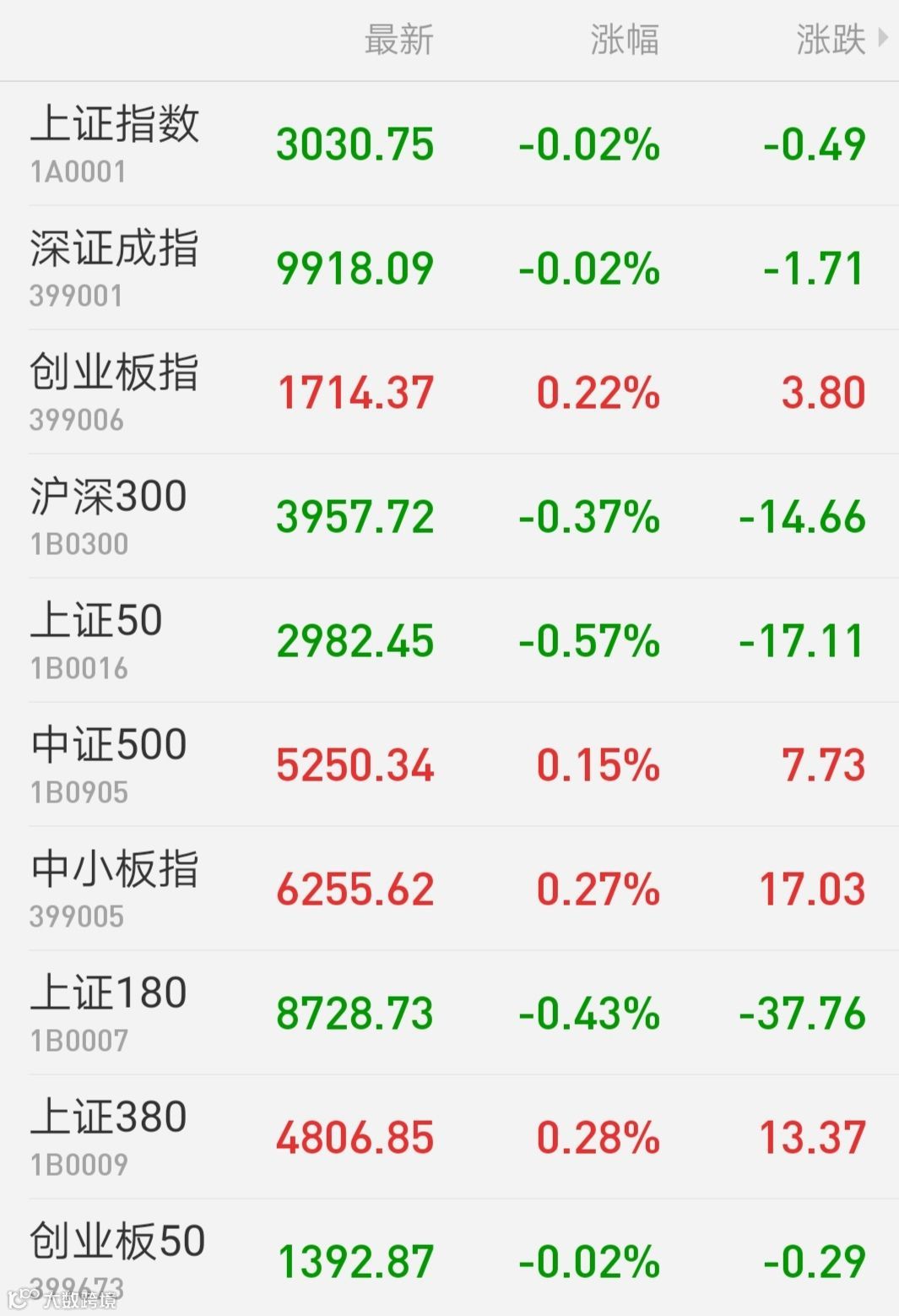 1、A股:能源强势不敌金融萎靡,上证指数震荡收跌0.02%,报收3030.75点;深成指跌0.02%,报收9918.09点;创业板指涨0.22%,报收1714.37点。万得全A跌0.68%。两市成交5813亿,较上一交易日小幅放大。北向资金全天净流入9.1亿元,为连续12日净流入。