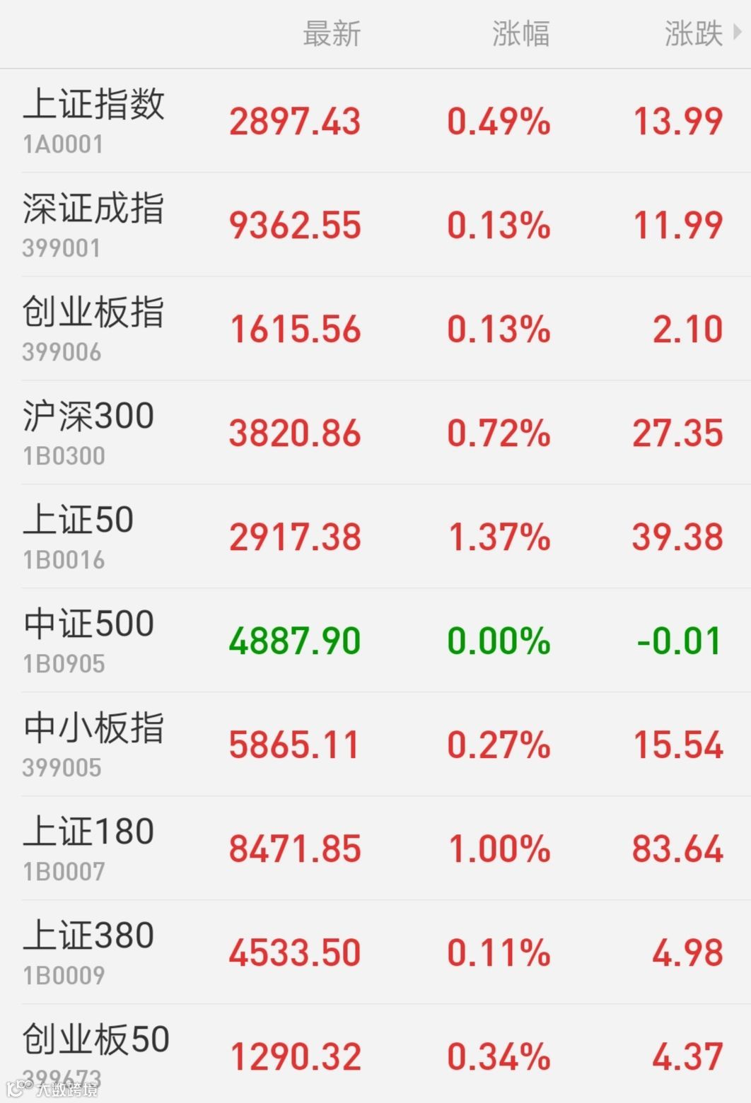 1、A股:上证指数涨0.49%报2897.43点,录得三连升,一度站上2900点;深证成指涨0.13%报9362.55点;创业板指涨0.13%报1615.56点;上证50涨1.37%;万得全A涨0.31%。两市成交4696亿元,较上日略有放大。ST康美午后炸板收跌超3%,此前连续四日涨停。上周,上证指数涨2.6%,连涨两周;深证成指、创业板指均涨逾3%。