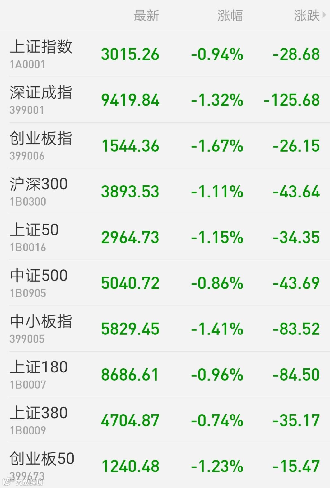 1、A股:A股缩量下探,白马股、科技股哑火。上证综指收盘跌0.94%报3015.26点;深证成指跌1.32%;创业板指跌1.67%。两市成交4881亿元,较上日继续缩量。北向资金呈现净流出态势。大消费板块午后走低,多只近期创历史新高个股回调明显,包括贵州茅台、五粮液、香飘飘、恒顺醋业、安井食品、中国国旅等。受国际金价大涨提振,黄金股表现强势。环保股全天强势,德创环保尾盘一笔涨停。此外,垃圾分类方面和污水处理方面均有多股涨停。南北船合并概念午后爆发,中船科技等多股涨停。科技类题材股普遍低迷,5G、国产芯片、OLED等跌幅靠前。