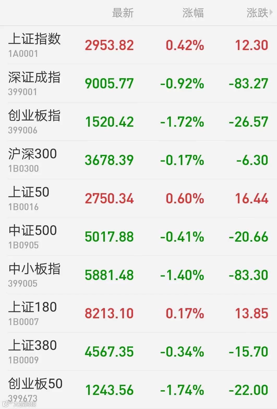 1、A股:两市再度冲高回落,上证综指收涨0.42%报2953.82点,盘中突破昨日高点,3000点拉锯战愈发胶着;深证成指跌0.92%险守9000点,创业板指跌1.72%报1520.42点,一度跌近3%;两市今日缩量成交不足9000亿元,上日成交1.1万亿元;北上资金净流入近49亿元。