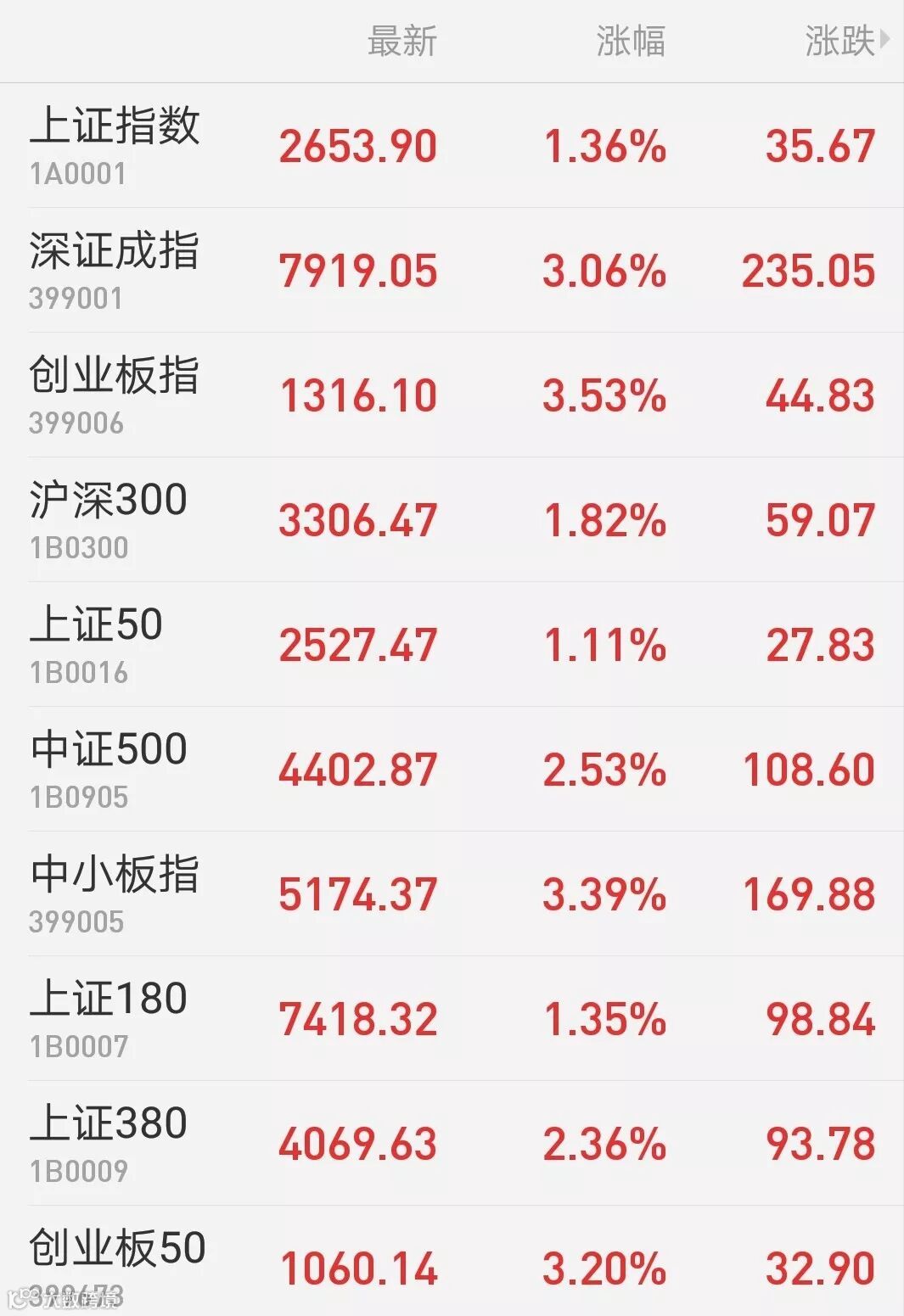 1、A股:A股猪年开门红,上证综指收涨1.36%报2653.9点,时隔一年后再次突破半年线;深证成指劲升3.06%报7919.05点,创业板指大涨3.53%报1316.1点。两市放量成交近3200亿元,近90股涨停。板块方面,猪肉股领衔农业板块掀涨停潮,5G、风电板块涨势强劲;白酒、有色股午后发力,贵州茅台市值突破9000亿元。银行股整体飘绿,万科A等地产龙头逆势下跌。