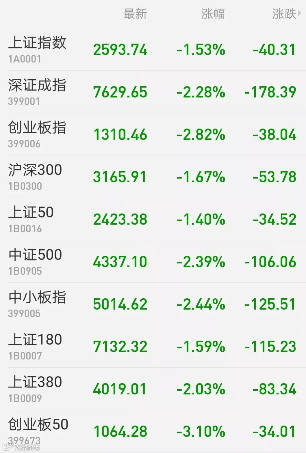 1、A股:两市全天单边下挫,上证综指收跌1.53%报2593.74点,深证成指跌2.28%报7629.65点,创业板指跌2.82%报1310.46点,万得全A收跌逾2%。两市成交刚过2900亿元。板块方面,5G等科技股全线走低,医药股再遭闷杀;权重股多数低迷,多只路桥股午后反抽但旋即回落;有色、军工、传媒等多个板块均表现不佳。上周,沪指跌0.5%,深成指跌逾1%,创业板指跌超2%。