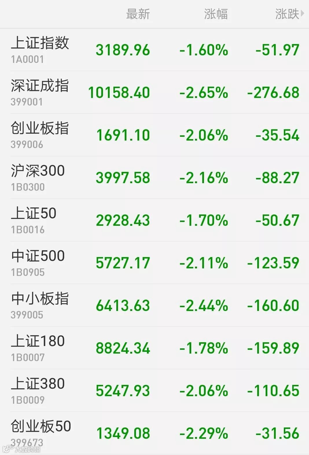 1、A股:A股单边下行,盘面热点匮乏。上证综指收盘跌1.6%报3189.96点;深证成指跌2.65%;创业板指跌2.06%失守1700点;万得全A跌2%。两市成交8158亿元,较上日缩减一成。