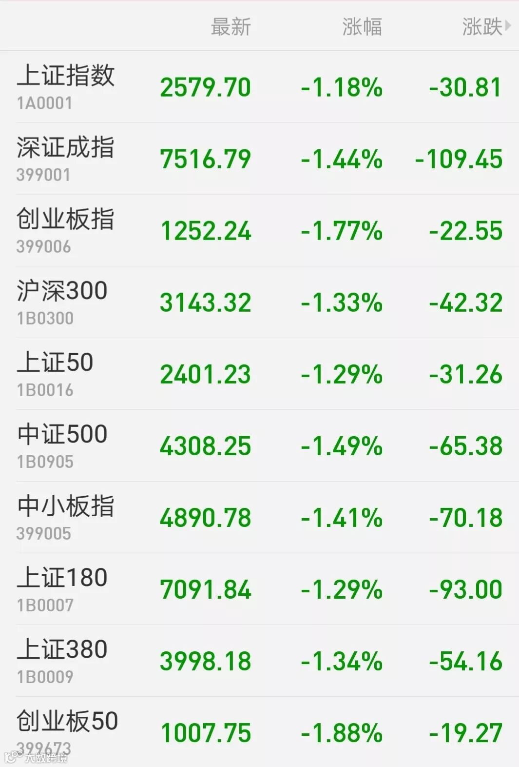 1、A股:沪深两市单边下行,上证综指收跌1.18%报2579.7点,刷新逾一个月来最大跌幅;深证成指跌1.44%报7516.79点,创业板指跌1.77%报1252.24点,万得全A收跌1.23%。两市缩量成交2786亿元。北上资金净流出近14亿元,终结连续5日净流入。板块方面,次新股逆势大涨,钛白粉等部分化工细分板块表现不俗;大消费板块整体跌幅居前,券商、钢铁、油服等多个板块走势低迷。个股方面,两市年报第一股金银河几近跌停;工业大麻龙头顺灏股份连续4日涨停;ST九有、*ST长生均连续跌停。