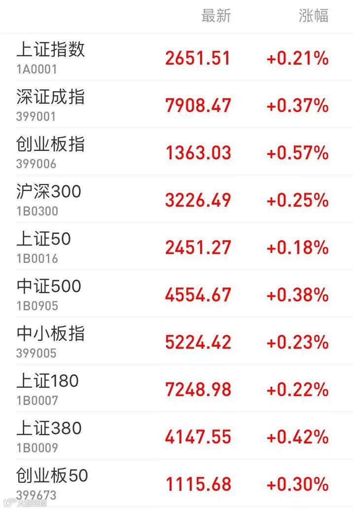 1、A股:沪深两市低开高走,上证综指收涨0.21%报2651.51点;深证成指涨0.37%报7908.47点,创业板指涨0.57%报1363.03点,万得全A收涨0.45%。两市成交不足3500亿元,近7日首次成交在4000亿元下方。盘面上看,物流板块异军突起,医药股领衔大消费板块整体转暖;农业、地产、传媒也都有不错涨势。创投板块继续分化,市北高新收涨1%止步12连板;原油期货连续重挫,石油板块承压明显。
