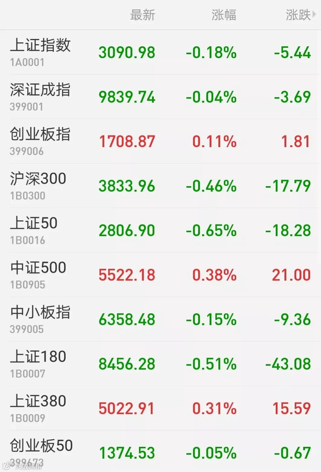 1、A股:两市缩量震荡,上证综指收跌0.18%报3090.98点,深证成指跌0.04%报9838.74点,创业板指涨0.11%报1708.87点;两市成交7756亿元,较上日同期缩量近600亿元,北上资金净流出16亿元。