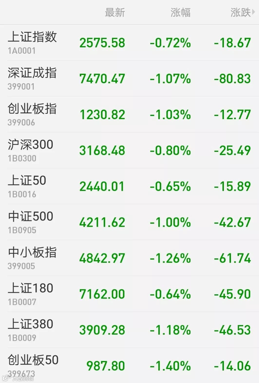 1、A股:沪深两市午后疲软,上证综指收跌0.72%报2575.58点,深证成指跌1.07%报7470.47点,创业板指跌1.03%报1230.82点,万得全A收跌1.04%。两市缩量成交2372亿元,北上资金连续6日净流入。板块方面,黄金、地产股抗跌,次新股尾盘急速杀跌,宇晶股份天地板;燃料电池、新零售板块全线下挫。业绩爆雷个股近期持续增加,西宁特钢等近15股批量跌停。