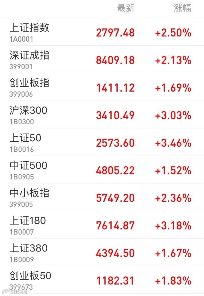 1、A股:上证指数报2797.48点,上涨2.50%,成交额1489.76亿。深证成指报8409.18点,上涨2.13%,成交额1725.15亿。创业板指报1411.12点,上涨1.69%,成交额464.07亿。两市合计成交3214.91亿。从盘面看,民航机场、银行等板块涨幅居前。
