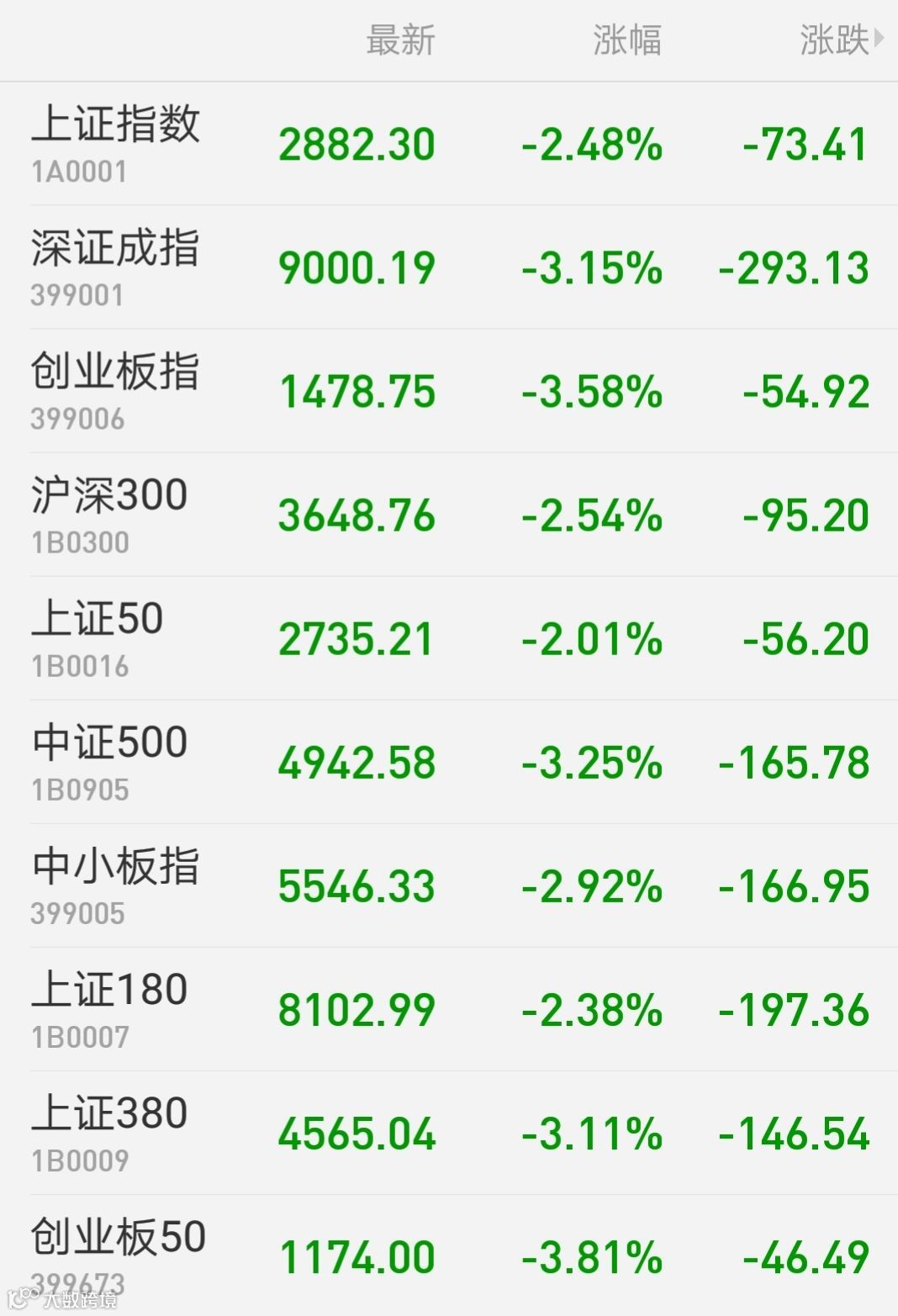 1、A股:上证综指失守2900点,收盘跌2.48%报2882.30点;深证成指跌3.15%报9000.19点;创业板指失守1500点,跌3.58%报1478.75点。两市成交5737亿元,较上日略有放大。国产芯片概念逆市大涨,