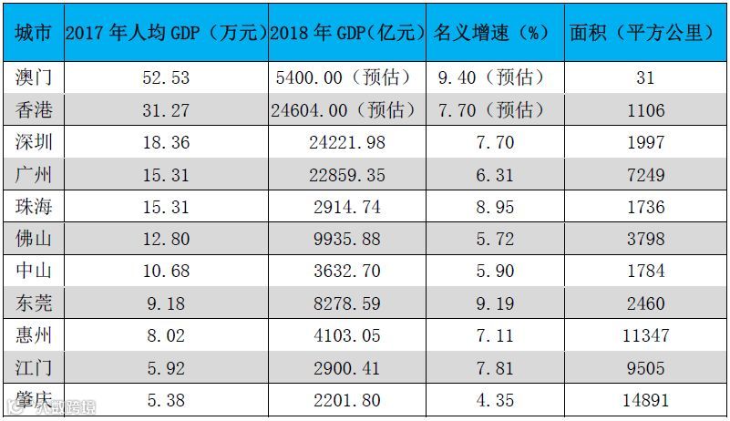 目前大湾区人均GDP排名前三位的城市分别是澳门、香港和深圳,但是不难发现,他们的面积都少的可怜,均不足2000平方公里。与之相反的是,人均GDP排名后三位的城市惠州、江门、肇庆却拥有着大量的土地,面积都在9000平方公里以上。澳门、香港、深圳等经济发达地区的面积过小,制约了其发展的上限,而惠州、江门、肇庆经济欠发达地区却空有大量土地,但是没有资金支撑其投入。