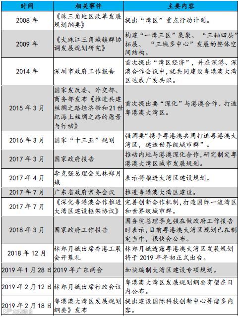 2019年2月18日晚间,中共中央、国务院印发《粤港澳大湾区发展规划纲要》,纲要对未来大湾区发展的大方向做了一个总括,未来大湾区发展路径已经愈发清晰,纲要公布之后预计更多实质性政策将加速落地,大湾区建设有望进一步提速。