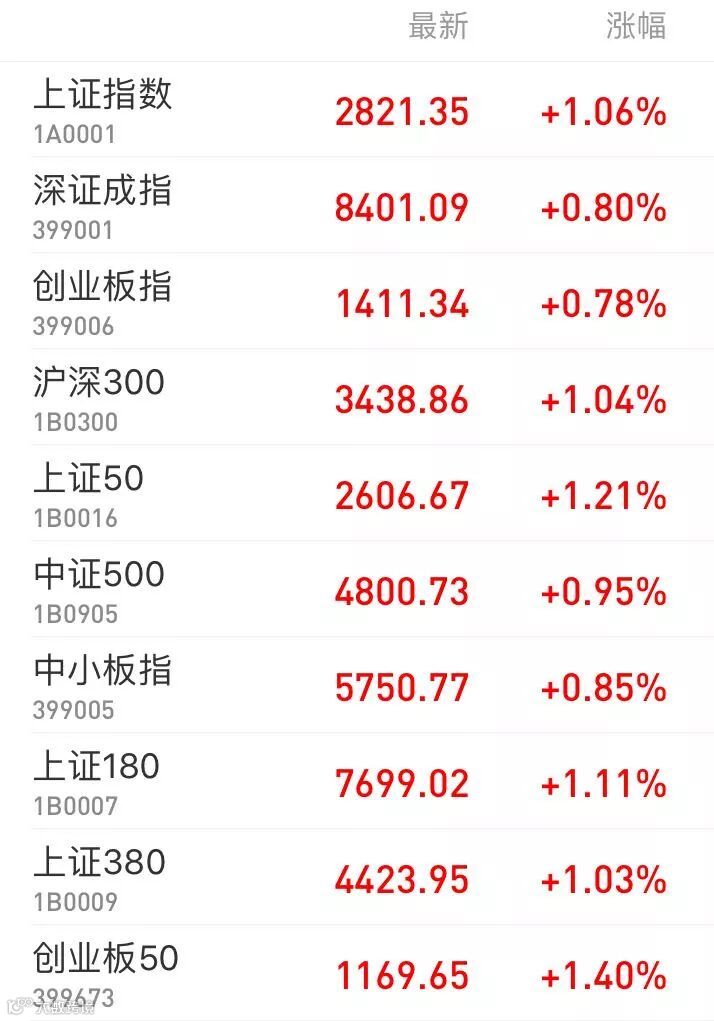 1、A股:两市节前最后一个交易日喜迎普涨。上证综指收涨1.06%报2821.35点,深证成指涨0.8%报8401.09点,创业板指涨0.78%报1411.34点,万得全A涨近1%。两市缩量成交2632.11亿元。一周(9.25-9.28),上证综指涨近1%,连涨两周;深成指和创业板指则几乎平盘。九月,上证综指涨逾3%,创近八个月来最大月涨幅,而深成指和创业板指则连跌6个月。