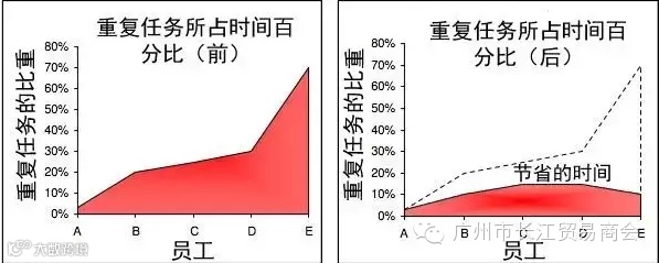 根据一份调查研究,一个5人的团队,经过2个月生产力的提高之后,5个成员将他们在重复的工作上花费的3%、20%、25%、30%和70% 的时间分别减少到3%、10%、15%、15%和10%。