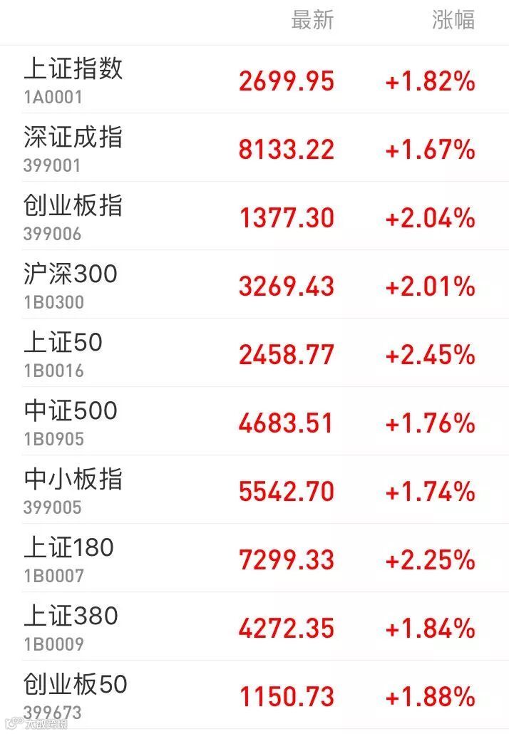 1、A股:上证指数报2699.95点,上涨1.82%,成交额1130.32亿。深证成指报8133.22点,上涨1.67%,成交额1406.31亿。创业板指报1377.30点,上涨2.04%,成交额425.75亿。两市合计成交2536.63亿。从盘面上看,工程建设、水泥建材等板块涨幅居前。