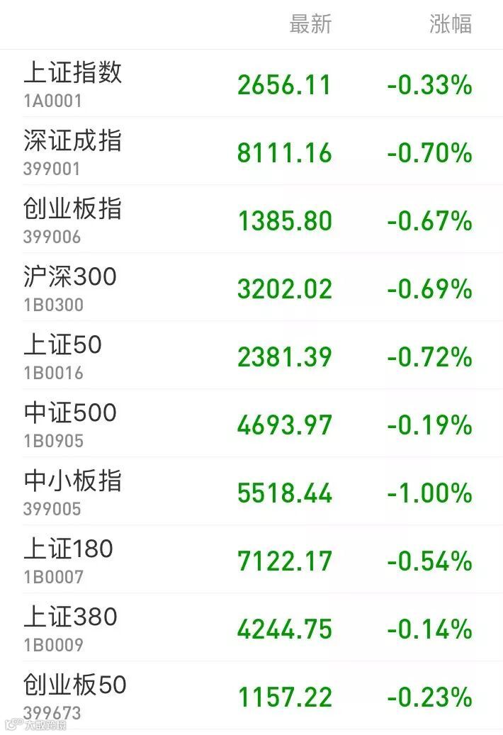 1、A股:上证指数报2656.11点,下跌0.33%,成交额934.48亿。深证成指报8111.16点,下跌0.7%,成交额1243.29亿。创业板指报1385.80点,下跌0.67%,成交额411.00亿。两市合计成交2177.78亿,创出四年新低。从盘面看,航天航空、船舶制造等板块涨幅居前。