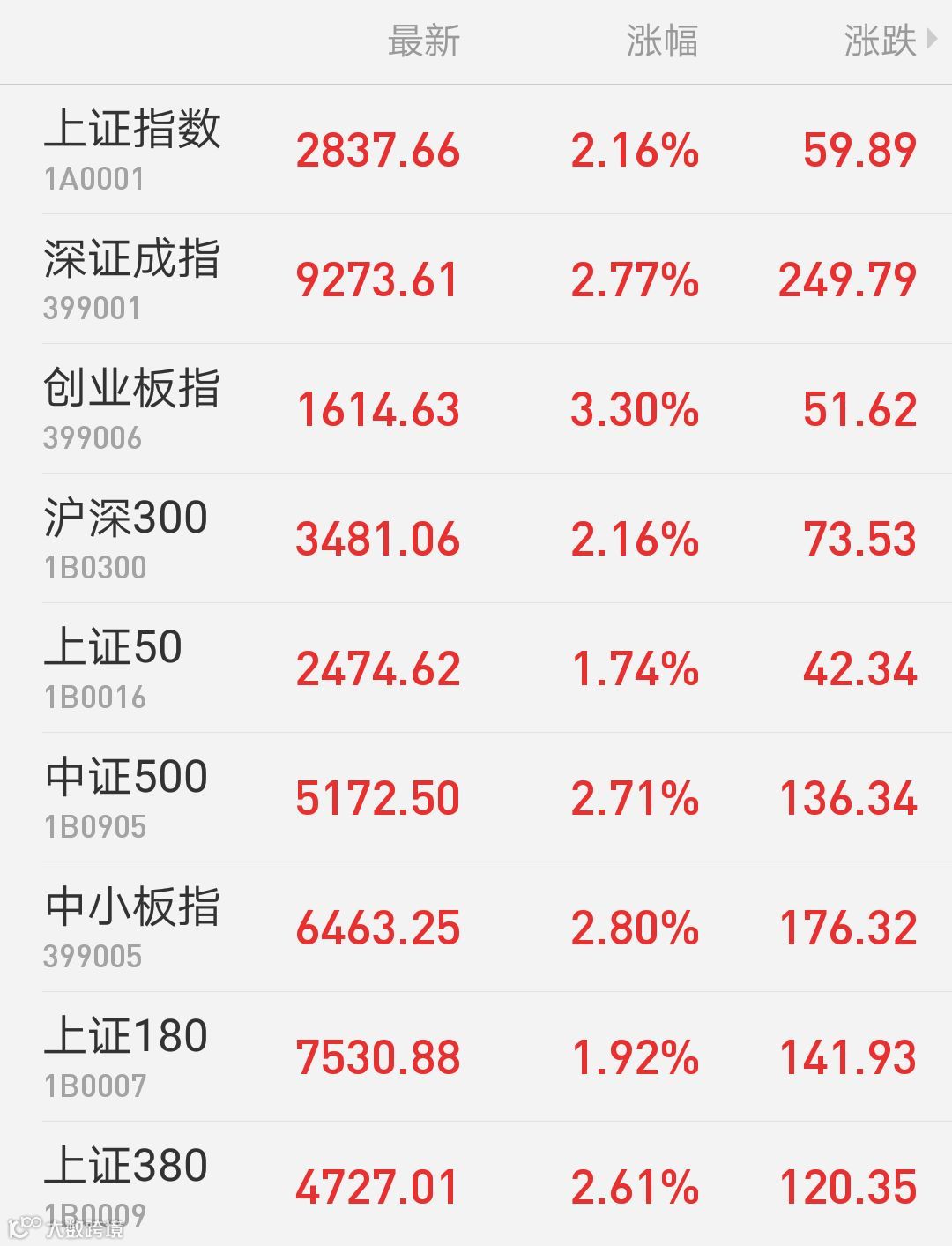 1、A股:上证指数报2837.66点,上涨2.16%,成交额1703.19亿。深证成指报9273.61点,上涨2.77%,成交额2455.05亿。创业板指报1614.63点,上涨3.30%,成交额981.67亿。两市合计成交4158.24亿。从盘面上看,工艺商品、电信运营等板块涨幅居前,两市无一板块收跌。