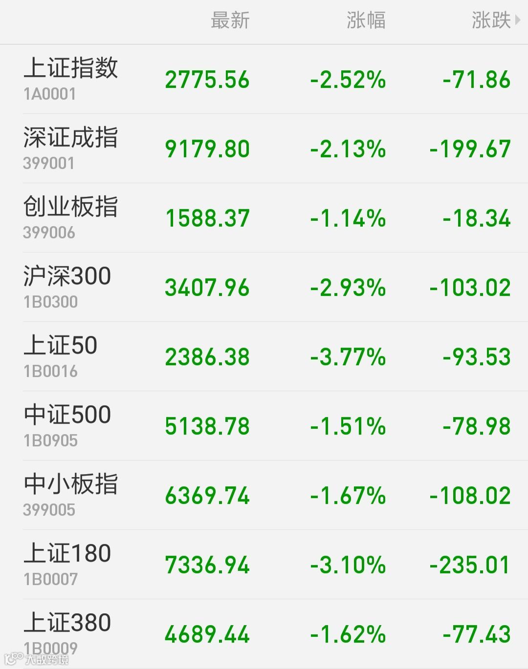 1、A股:上证指数报2775.56点,创28个月新低,下跌2.52%,成交额1475.63亿。深证成指报9179.80点,下跌2.13%,成交额2100.83亿。创业板指报1588.37点,下跌1.14%,成交额752.30亿。两市合计成交3576.46亿。从盘面上看,行业板块全线下跌。