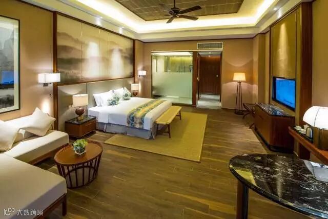 惠州温泉度假酒店客房的设计呼应着整个酒店的氛围,客房背景运用大幅的山水映象与窗外的山水融为一体,温馨沉稳的色调让整个空间祥和宁静,宽敞的空间、周全的功能设施和户外的温泉真正给顾客一种五星级的享受。