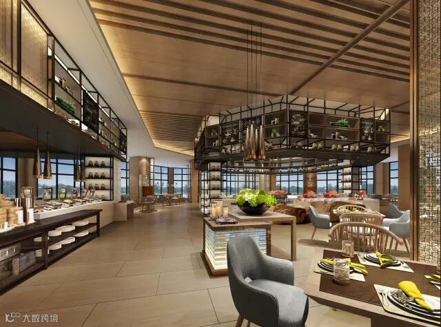 酒店负一层是全日制餐厅和康体区、娱乐区,全日制餐厅设计出浓浓东南亚风情,其天花及立面处理给予一种不同于大堂恢弘气势,像置身于异域风情的餐厅,玻璃的屏风隔断将整个空间提亮,隔而不断。