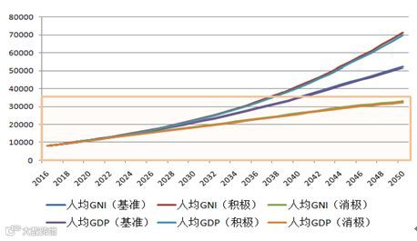 在人口总量变化的基础上,测算未来人均GDP。在基准情况下,2035年人均GDP为2.6万美元,2050年为5.2万美元;在积极情况下,2035年人均GDP为3万美元,2050年为7万美元;在消极情况下,2035年人均GDP为2.2万美元,2050年为3.3万美元。人均国民收入GNI与人均GDP是两个不同概念,2016年我国人均GDP为8123美元,人均GNI为8260美元。随着一带一路战略和我国企业走出去发展,人均GNI可能保持在略微大于人均GDP的水平。