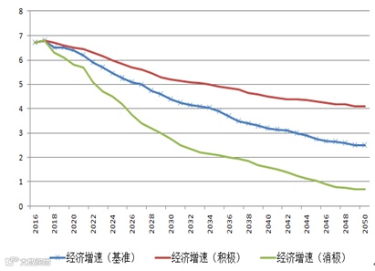 我国在2010年进入上中等收入国家之后,经济增速开始出现放缓,经济增速已经从前三十年年均10%以上放缓至2016年的6.7%。未来经济增速继续放缓是必然,但增速放缓的幅度和程度就取决于通过深化改革开放和鼓励创新等措施提升全要素生产率带来的经济潜力释放的情况。我们分基准、积极及消极三种情景来模拟未来中国经济的发展趋势。