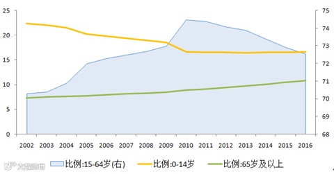 从经济增长的长周期来看,随着人口结构的转变,我国逐渐步入老龄化社会,经济增速将逐渐放缓。2009年我国15-64岁的劳动人口比例达到74.5%的顶峰之后逐渐下降,2016年为72.6%。从劳动人口绝对数量来看,15-59岁劳动年龄人口在2012年就出现了改革开放以来的第一次绝对下降。我国人口红利走到尾声,高储蓄、高投资和高增长的局面难以维持,经济增长动能从投资需求向消费需求转变。与劳动人口比例走势相同,我国总储蓄率在2010年达到顶点的50.9%,之后逐渐下降,目前为47.9%。人口结构变化带来需求结构转变,投资需求走弱将导致经济增速放缓。但随着城乡居民更加注重对美好生活的向往,消费倾向提高将为经济结构转型提供条件,促使经济增长动能从投资向消费转变。