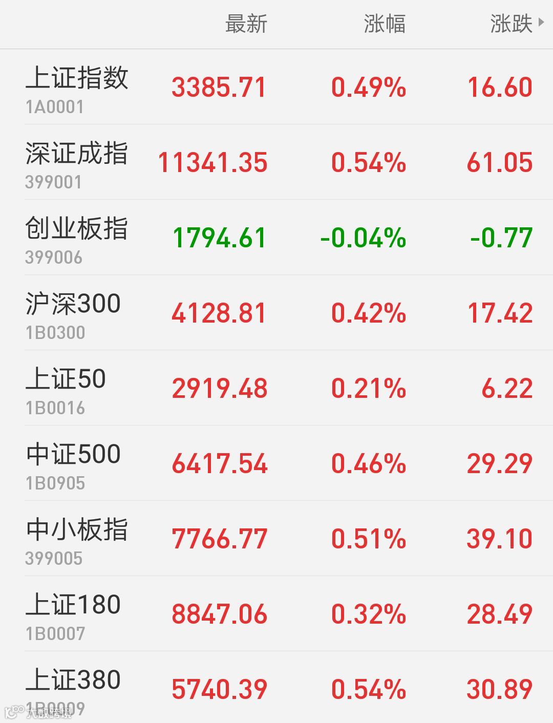 1、A股:上证指数报3385.71点,上涨0.49%,成交额2430.91亿。深证成指报11341.35点,上涨0.54%,成交额2533.07亿。创业板指报1794.61点,下跌0.04%,成交额568.68亿。两市合计成交4963.98亿。从盘面上看,上海自贸、可燃冰等板块涨幅居前。
