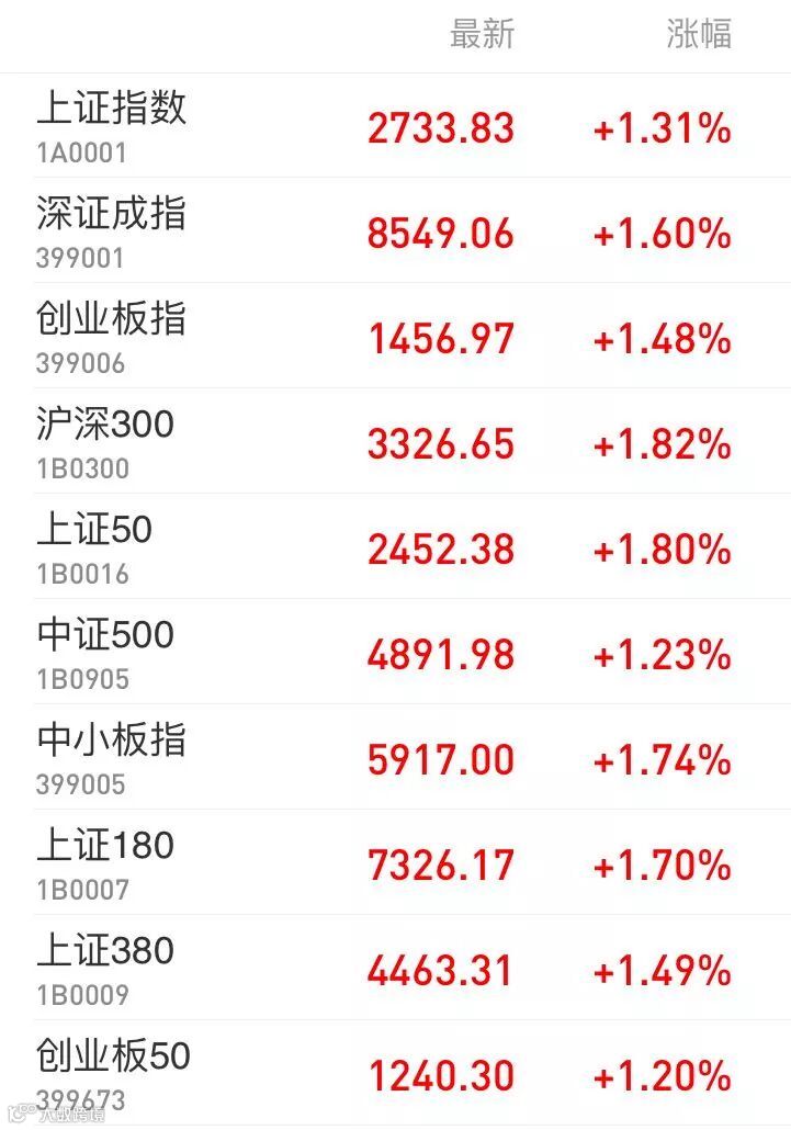 1、A股:上证指数报2733.83点,上涨1.31%,成交额1222.60亿。深证成指报8549.06点,上涨1.60%,成交额1585.87亿。创业板指报1456.97点,上涨1.48%,成交额516.52亿。两市合计成交2808.47亿。从盘面看,民航机场、造纸印刷等板块涨幅居前。