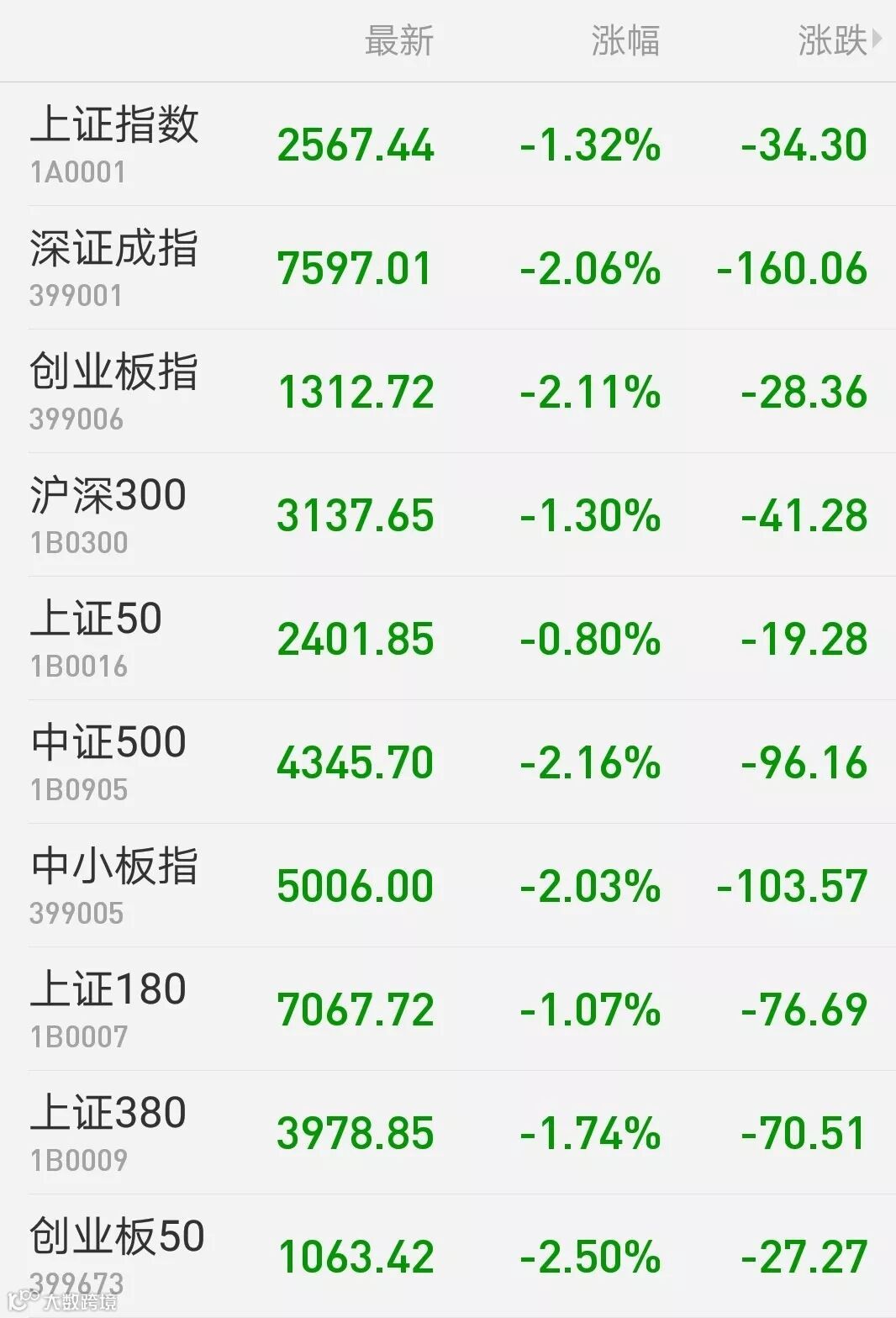 1、A股:沪深两市午后单边下挫,上证综指收跌1.32%报2567.44点,深证成指跌逾2%失守7600点,创业板指跌2.11%报1312.72点,万得全A收跌1.8%。两市缩量成交3100亿元。北上资金今日逆势净流入近11亿元,其中沪市净流入13亿元。板块方面,黄金、农业股再获避险资金垂青;次新股领跌,5G板块全线回调,海南板块遭一日游行情;券商板块失去光彩,传媒、计算机、地产也都表现低迷。