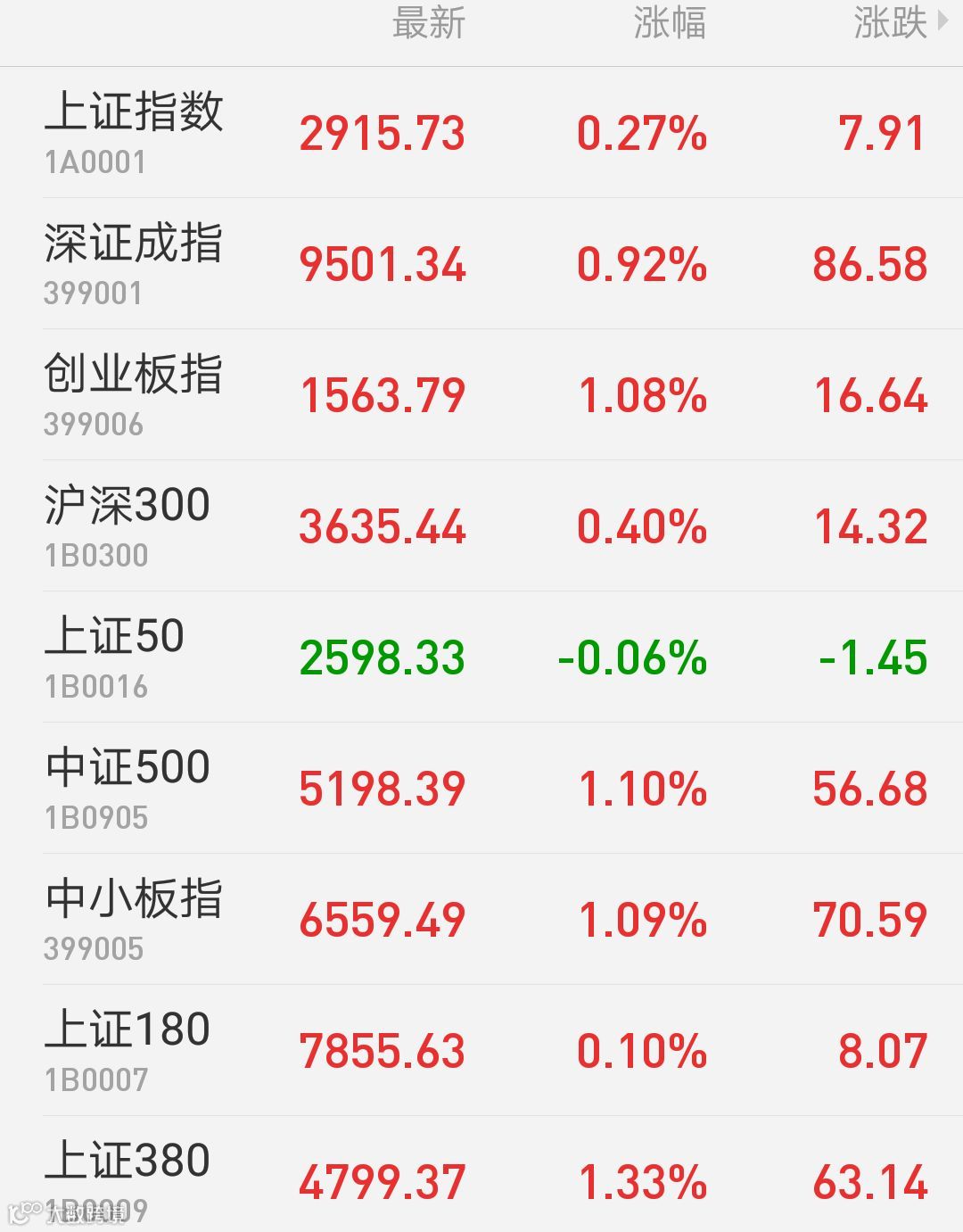 1、A股:上证指数报2915.73点,上涨0.27%,成交额1533.34亿。深证成指报9501.34点,上涨0.92%,成交额1948.75亿。创业板指报1563.79点,上涨1.08%,成交额670.53亿。两市合计成交3482.09亿。从盘面上看,钢铁行业、航天航空等板块涨幅居前。