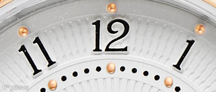 时间刻度使用具有现代感的阿拉伯数字来表示,将这种古老而又现代的文明印记,完美呈现于表盘之中,营造优雅恬静的艺术感,略微凸起的字体进一步增加了现代立体感。而每一刻度也相对应地爪镶着锆石,起到了很好的装饰作用,打造了突出的视觉效果。
