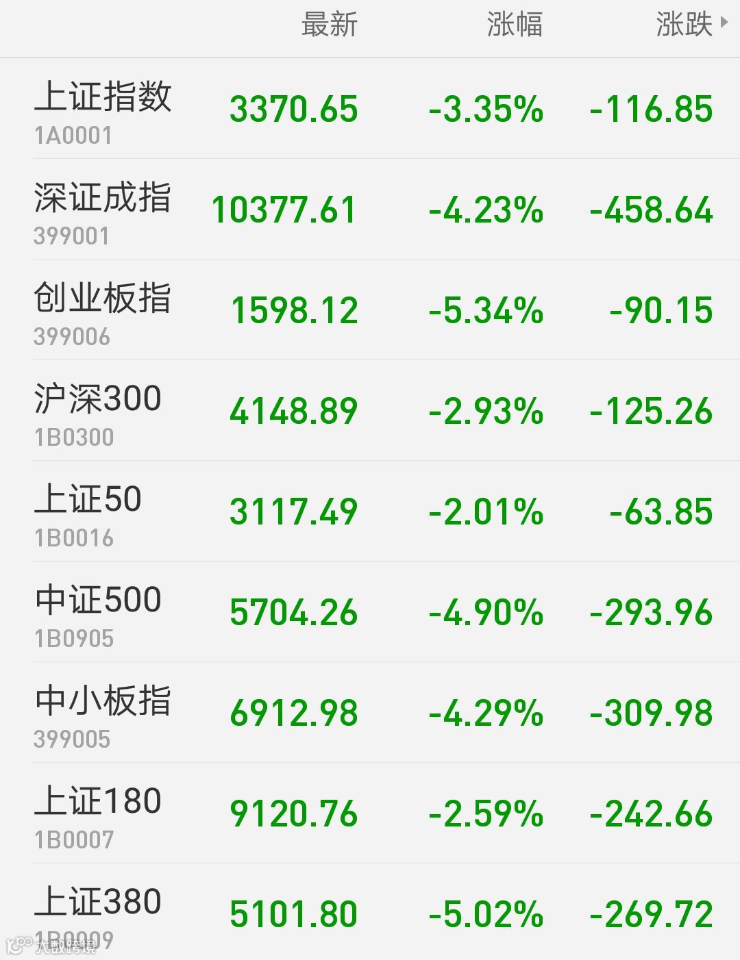 1、A股:上证指数报3370.65点,下跌3.35%,创两年来最大单日跌幅,成交额3188.19亿。深证成指报10377.61点,下跌4.23%,成交额2408.27亿。创业板指报1598.12点,下跌5.34%,成交额614.05亿。两市合计成交5596.46亿。