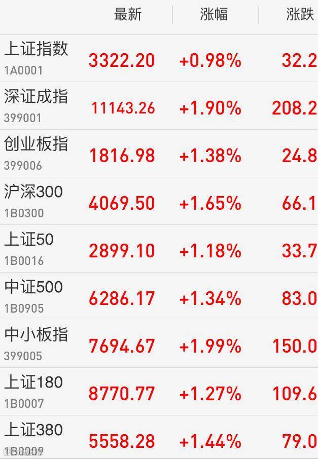 1、A股:上证综指单边上行,收盘涨0.98%报3322.2点,先后收复3300点和半年线;深成指涨1.9%报11143.26点;创业板指涨1.38%重返1800点;中小板指涨2%。两市成交仅4000亿元,量能制约反弹高度。 白马股连续反弹,成为市场中坚力量,大数据概念掀涨停潮。
