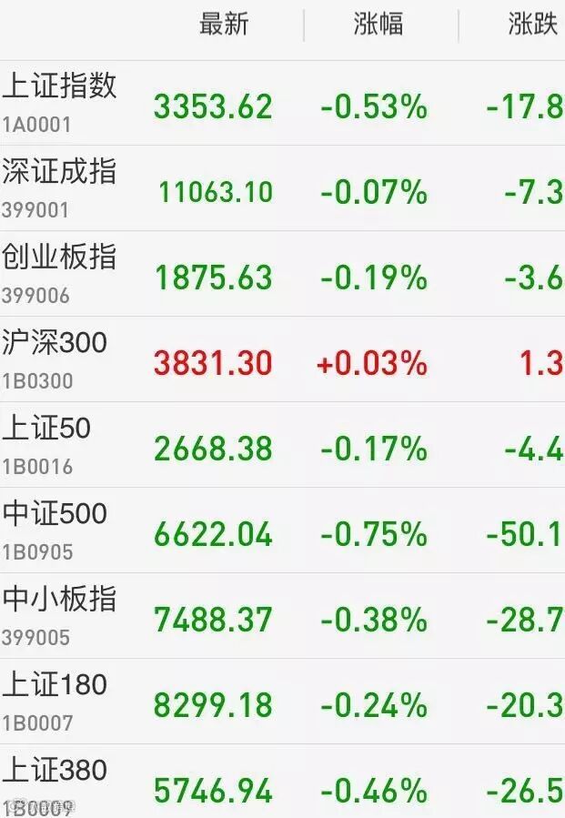 1、A股:上证综指收盘跌0.53%报3353.62点;深证成指跌0.07%收报11063.1点;创业板指跌0.19%收报1875.63点。地产股逆势上涨,万科A创出历史新高。上周上证综指跌0.35%,连跌两周;深证成指涨0.84%,连涨五周。