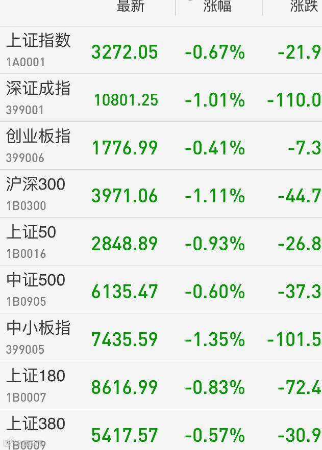 1、A股:A股继续弱势下探,上证综指收跌0.67%报3272.05点,连跌4日;深成指跌1%;创业板指跌0.41%,盘中一度巨震翻红。两市成交不足3500亿元,创5个月来新低。5G概念活跃,军工股集体拉升,大金融、白马、周期板块低迷,制约股指走势。