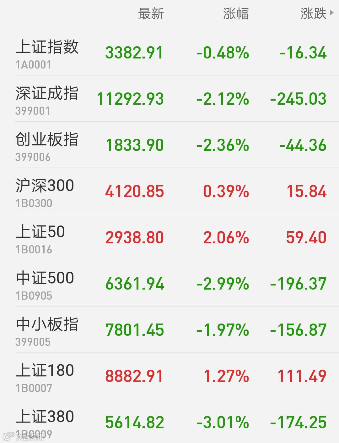 1、A股:上证指数报3382.91点,下跌0.48%,成交额3137.50亿。深证成指报11292.93点,下跌2.12%,成交额3323.99亿。创业板指报1833.90点,下跌2.36%,成交额876.67亿。两市合计成交6461.50亿。从盘面上看,银行、保险等板块涨幅居前。