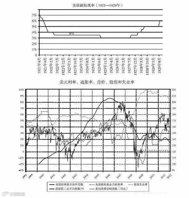6. 两次危机都与货币政策相关联。在两次危机之前,最方便的手段是采取更为宽松的货币信贷政策。大萧条前,泛滥的信贷政策引起了股市的泡沫和投机的狂热;在这次危机前,美联储极其宽松的货币政策、金融放松监管和次级贷款都达到前所未有的水平,使得经济泡沫恶性膨胀。在经济泡沫导致消费价格上涨的压力下,货币当局不得不采取紧缩货币政策,从而捅破了泡沫,改变了投机者的心理预期,使得迟早发生的事终于发生(见图4)。两者的主要区别在于,1929年大萧条还没有明确的宏观经济理论指导,而本次金融危机则是宏观经济政策长期服从于政治选举目标。两者的共同之处在于,货币当局对宏观经济形势都缺乏准确的理解,大萧条时期美联储的决策者基本没有总需求管理的意识,而这次美联储则对已经全球化的世界经济与美国作为储备货币国所应该执行的货币政策认识很不到位。