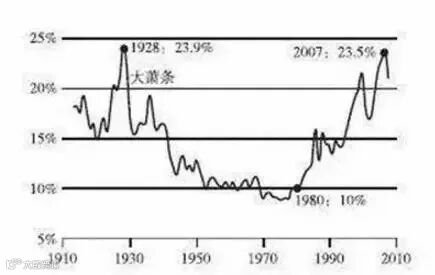 图2:两次危机前美国收入两极分化达到历史高点(最富1%收入占总收入比例)