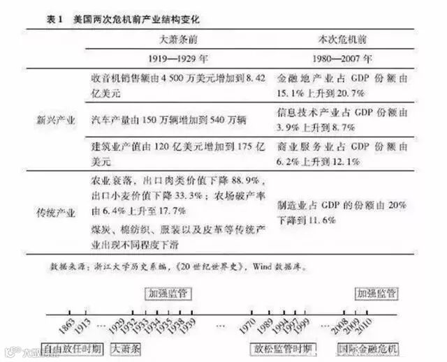 2. 在危机爆发之前,都出现了前所未有的经济繁荣,危机发源地的政府都采取了极其放任自流的经济政策。1929年大萧条之前,柯立芝总统实行了以放任自流著称的经济政策,政府对市场经济的运行基本保持缄默,金融利益集团也对放松监管、推动金融自由化发挥了巨大影响。在此期间,新技术的推广和应用首先集中在电力行业和汽车行业,自由竞争使主要行业的产业集中度和垄断程度大幅度提高,劳资对立由于经济繁荣得到一定缓解,而弱势的农业相对衰退,埋下了产业失衡、收入分配差距扩大和经济投机性增强等种种隐患。但不管怎样,经济的放任自流政策创造了著名的“柯立芝繁荣”。在本次金融危机发生之前,在强大的产业和金融利益集团作用下,从克林顿到小布什政府也都采取了经济自由化的政策,在某种程度上,其实际的经济放任程度和对监管的放松接近甚至超过里根政府的做法。在此期间,新技术的推广应用使信息通讯产业和互联网经济得到快速发展,房地产业的繁荣已经出现,美国经济确实出现了人类社会有史以来最长久的繁荣,人们乐观地认为,由于互联网技术的发展,传统的商业周期已经不复存在。在两次繁荣期间,经济的自由放任和企业家创新精神的发扬互为补充,推动着经济的高增长,但也与后来危机的发生存在某种逻辑关系。十分明显的是,发达国家已经出现了制造业的衰落,越来越多的劳动者已经无法适应产业结构的快速变化,过度负债的经济模式已经充满风险。