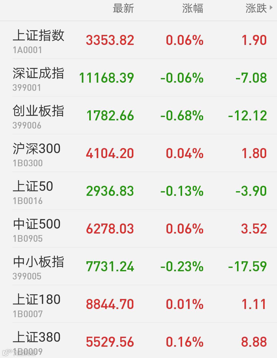 1、A股:上证指数报3353.82点,上涨0.06%,成交额2076.24亿。深证成指报11168.39点,下跌0.06%,成交额2325.50亿。创业板指报1782.66点,下跌0.68%,成交额573.23亿。两市合计成交4401.74亿。从盘面上看,有色金属、民航机场等板块涨幅居前。