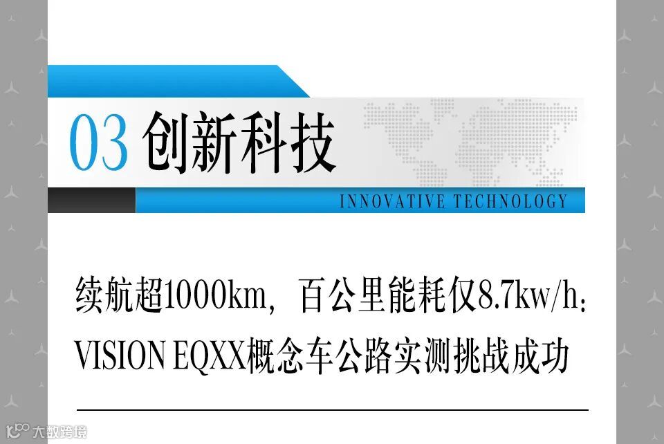 日前,梅赛德斯-奔驰VISION EQXX概念车在欧洲完成首次真实交通中的能效之旅。凭借单次充电续航超过1000公里的超高能效,VISION EQXX概念车创造了平均每百公里仅8.7千瓦时耗电量的梅赛德斯-奔驰史上最低能耗,成就了电动汽车能效新标杆。VISION EQXX概念车自德国辛德芬根出发,以140公里/小时的高速巡航和87.4公里/小时的平均时速,经过11小时32分钟完成长达1008公里的公路旅行,最终抵达法国卡西斯,剩余电量约15%,展示出VISION EQXX概念车无与伦比的续航实力与高效性能。