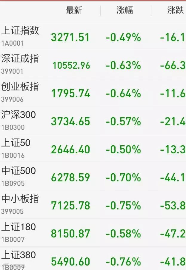 1、A股:上证综指继续陷入3300点久攻不下的泥潭,收盘跌0.49%报3271.51点;深成指跌0.63%报10552.96点;创业板下挫0.64%失守1800点。两市成交4077亿元,上日为4309亿。