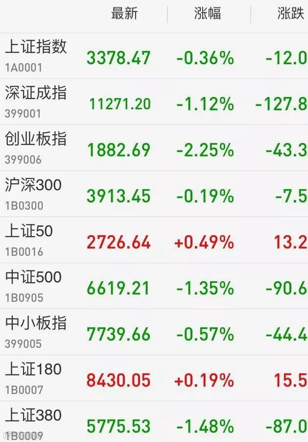1、A股:上证综指冲高回落,放量收跌0.36%报3378.47点,盘中一度冲上3400点;深成指跌1.12%报11271.2点;创业板指单边下行,跌2.25%报1882.69点。两市成交5459亿元,上日为4587亿。