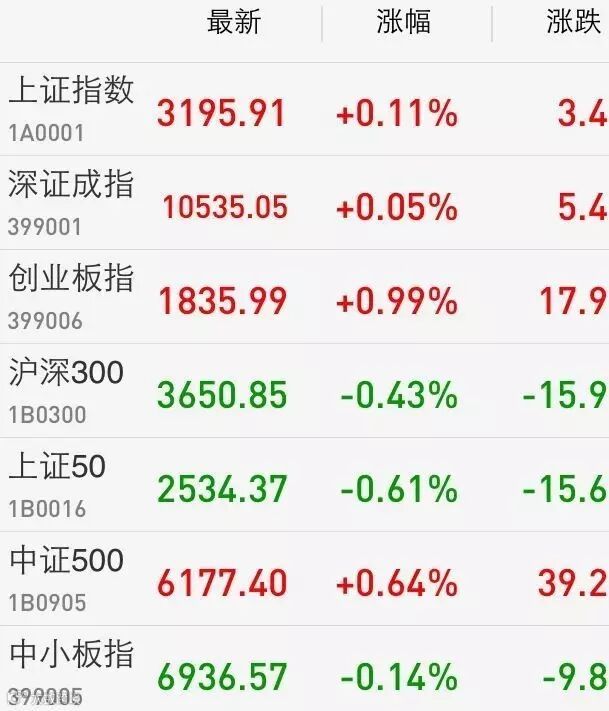 1、A股:上证综指收盘涨0.11%报3195.91点,距离3200点一步之遥;深成指涨0.05%报10535.05点;上证50指数则下挫0.6%;创业板指涨0.99%。两市成交3697亿元,仍处于阶段低位。