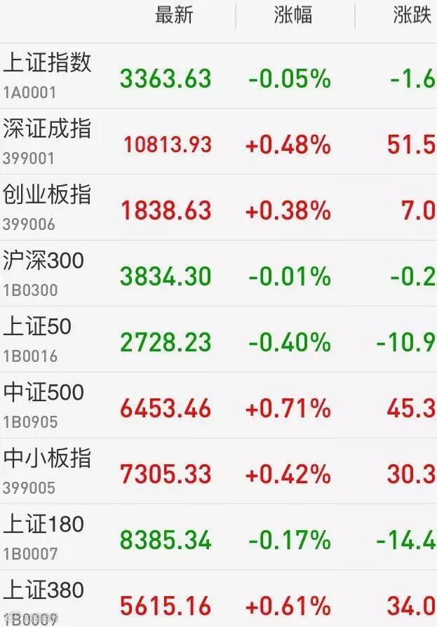 1、A股:上证综指收盘跌0.05%报3363.63点,深证成指涨0.48%收报10813.93点,创业板指涨0.38%收报1838.63点,中小板指涨0.42%收报7305.33点。两市成交金额5607亿元,上日为5649亿元。