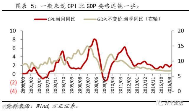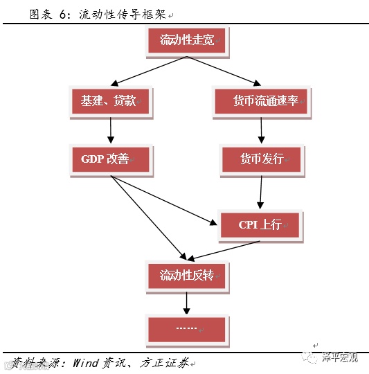 经济基本面包括经济增长(GDP)和价格(CPI)。从货币数量公式MV=PQ来看,GDP和CPI是同源的,因此M和V是GDP和CPI的一个共同的因。当流动性走宽时,会分别引致GDP和CPI出现趋向性改变,而一般来说CPI比GDP要略迟钝一些。除了GDP往往是按实际值计算之外,货币映射在CPI上还多了一个传导到“货币发行”的过程,在下文中我们会详细解释。