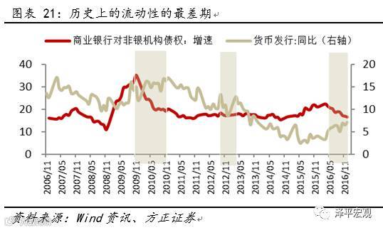 因为有大量活动现金及货币存量,因此往往容易出现比较显著的通胀风险或金融风险,这时往往会引来政策的加剧调控。在2010年时,出现了比较严重的滞涨风险;2013年时,金融层面的非标及表外风险显著;2016年也存在较大的委外及杠杆风险。